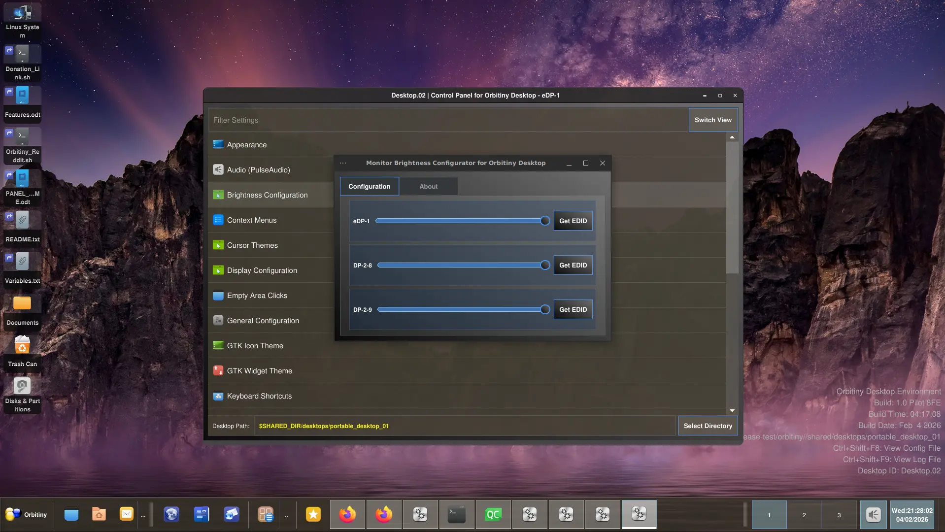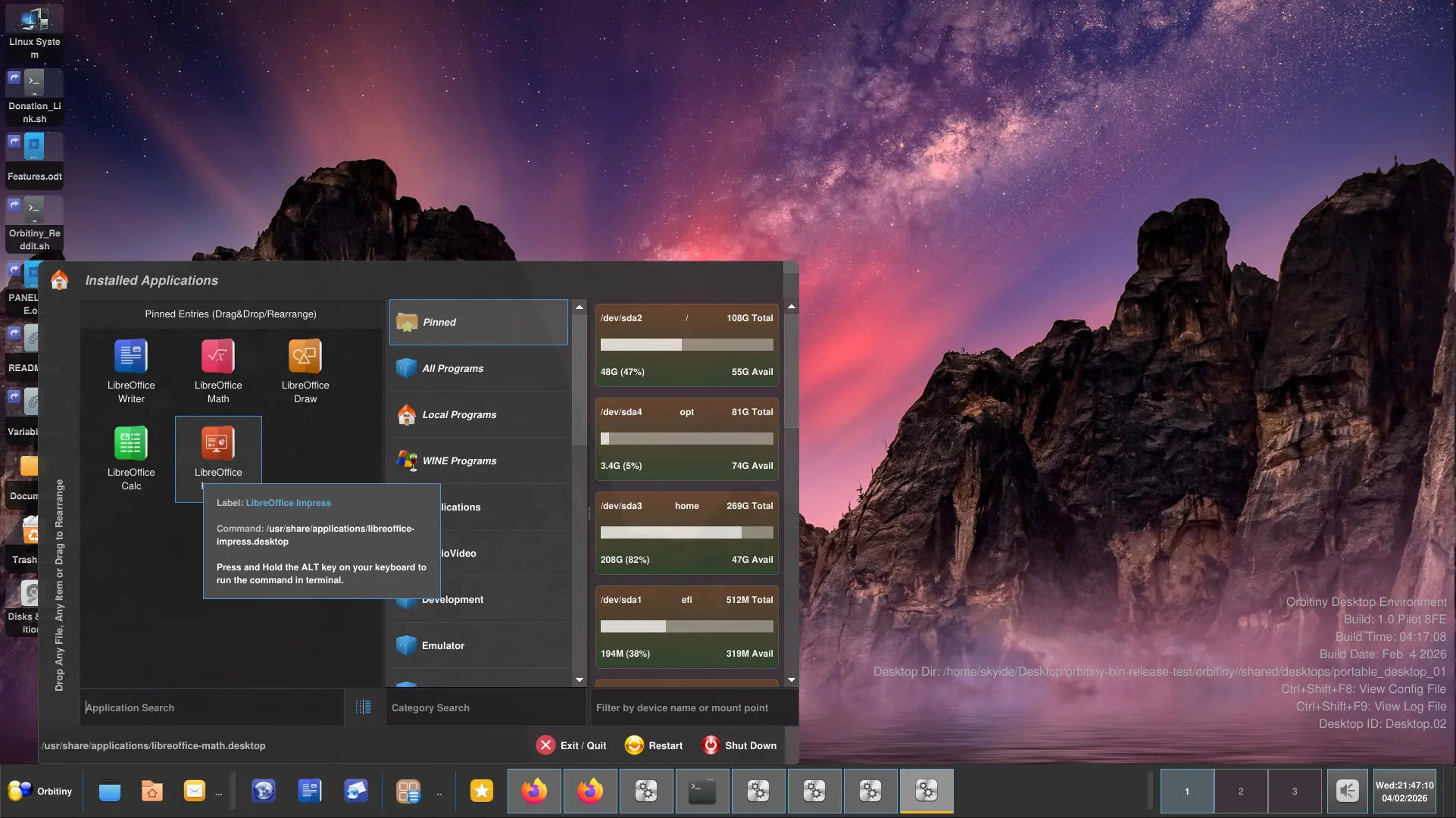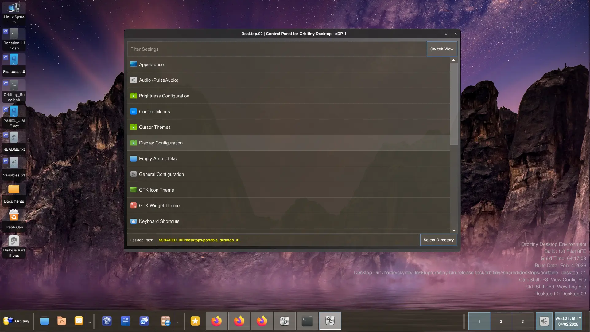 Want to install it system-wide and be accessible from your Display Manager’s menu? No problem! Just run the graphical install-orbitiny script using sudo. As a system-wide desktop (non-portable mode), the settings will be saved to $HOME/.config/orbitiny for each user.