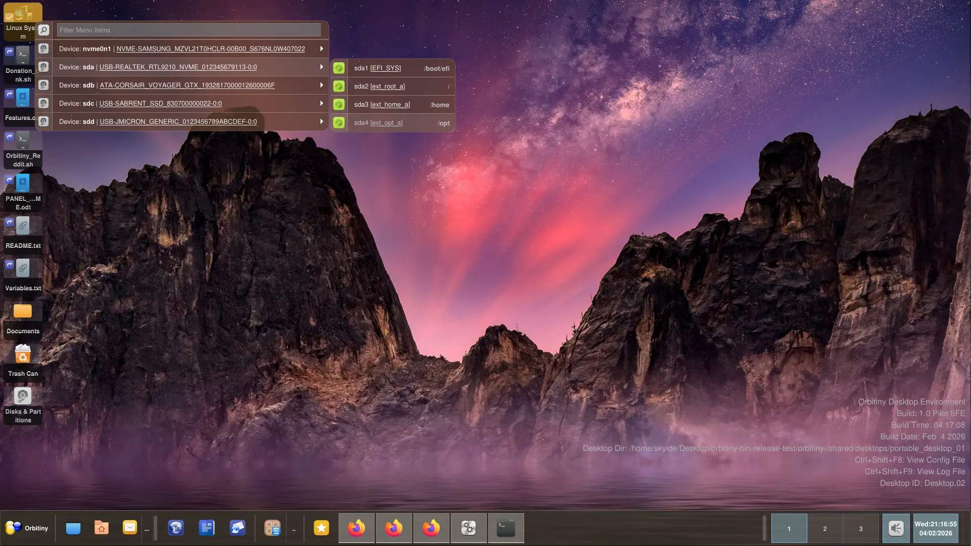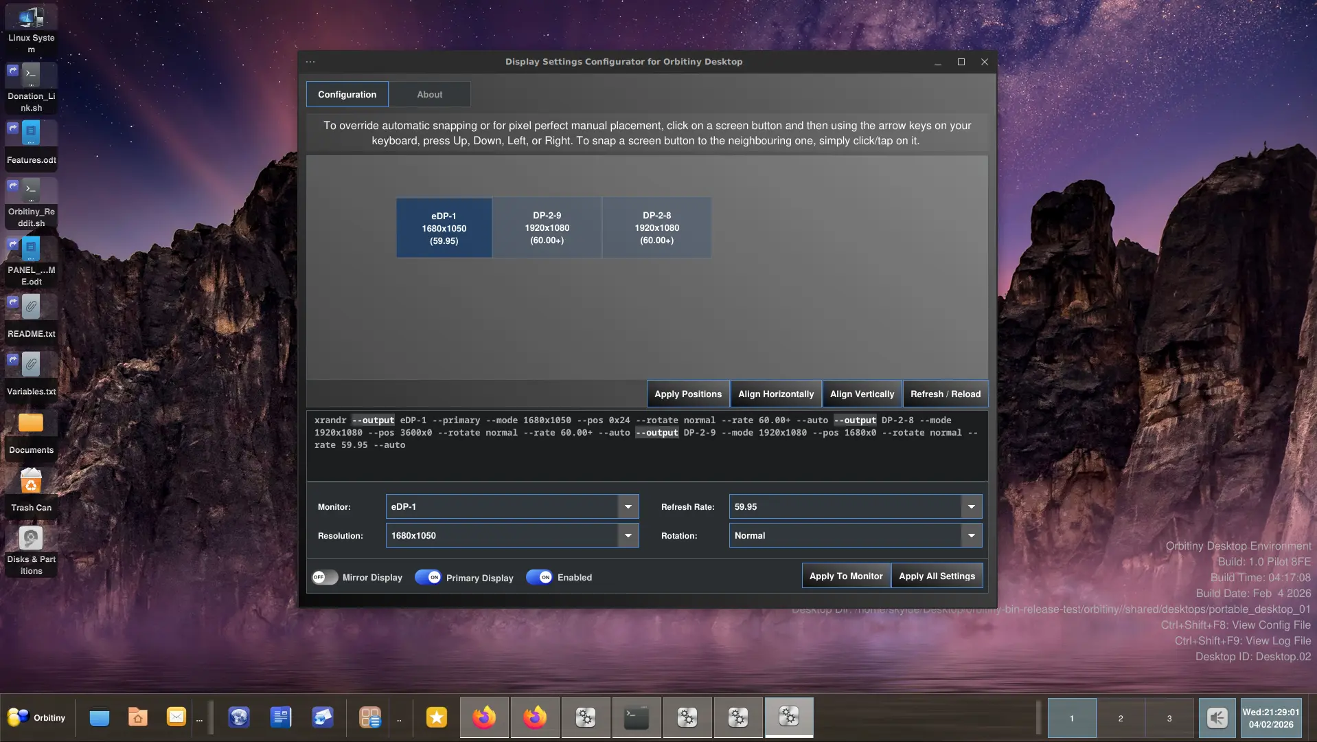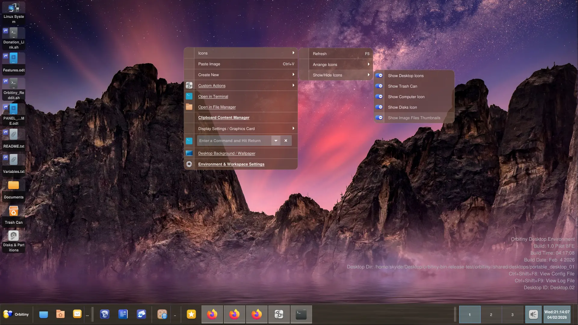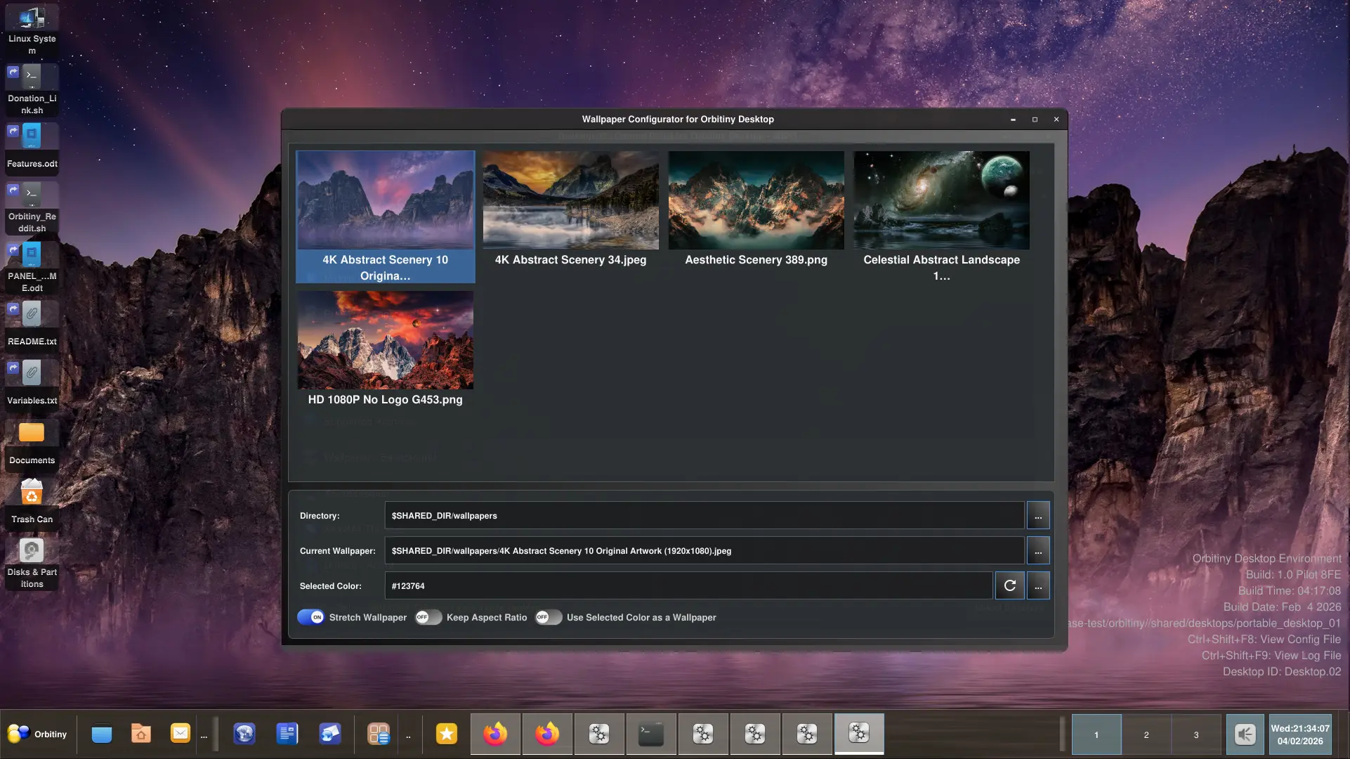 Want to install it system-wide and be accessible from your Display Manager’s menu? No problem! Just run the graphical install-orbitiny script using sudo. As a system-wide desktop (non-portable mode), the settings will be saved to $HOME/.config/orbitiny for each user.
