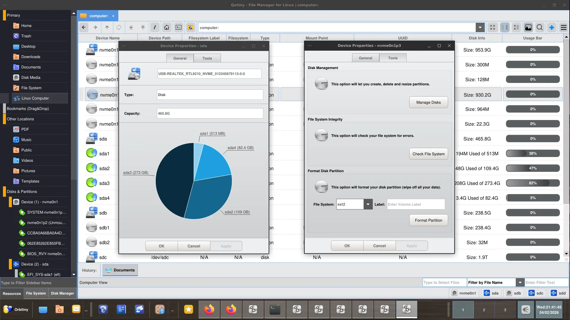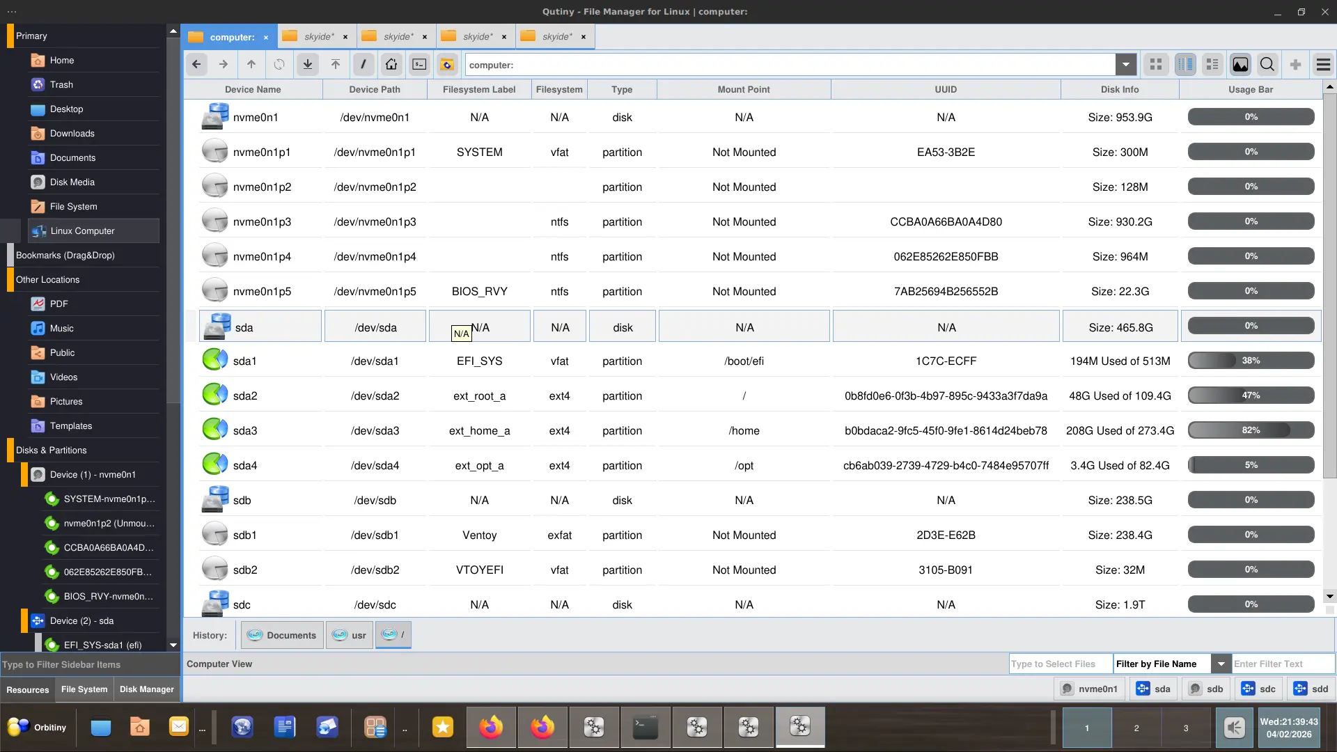 - Mount Point Directory Icons – Special icons to mount point directorries. This way, you can easily distinguish mount points from normal directories and the associated device name of the mount point is appened to the caption of the mounted directory’s file icon. E.g: If /dev/sdc1 is mounted on “/mnt/my_point” and you navigate to /mnt, Qutiny file manager will append “(/dev/sdc1)” to the mounted directory’s icon caption. So, for example, instead of seeing a file icon named “my_mount_point” when browsing to /mnt, you will see “my_mount_point (/dev/sdc1)” if “my_mount_point” was associated with /dev/sdc1. Not only that, it also shows a different icon. This gives you a visual indication that the directory you are looking at is a mount point and that the mounted directory’s associated device is /dev/sdc1. See screenshot for more details. So, you don’t have to use a terminal to find out what the associated device of a specific mount point is. This works anywhere in the file system with any mount point anywhere in the filesystem.