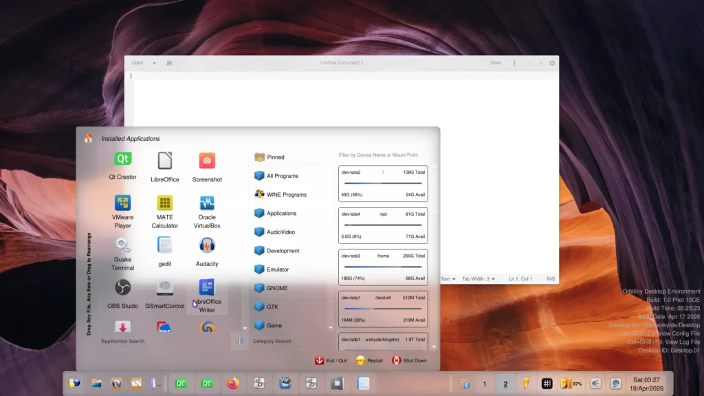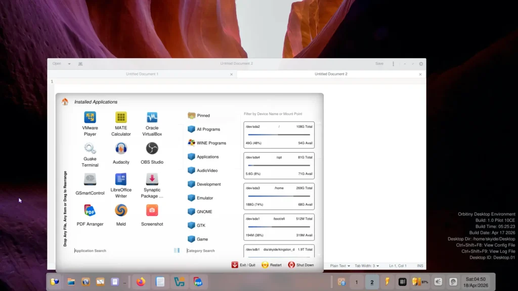 Btw, take a look at the battery monitor applet in vertical mode (the panel on the left). To preserve room, I’ve centered the icon and displayed the battery % in the middle so it too looks like a button, yet it does what’s supposed to be doing. Perhaps I will do the same thing in the horizontal version. Of course, the applet configures itself based on the way the panel is oriented. The whole thing is very versatile, you can probably create a word processor as a plugin (if there was room).